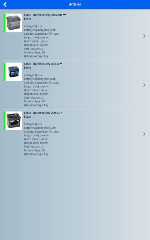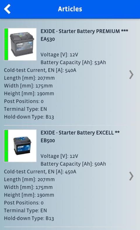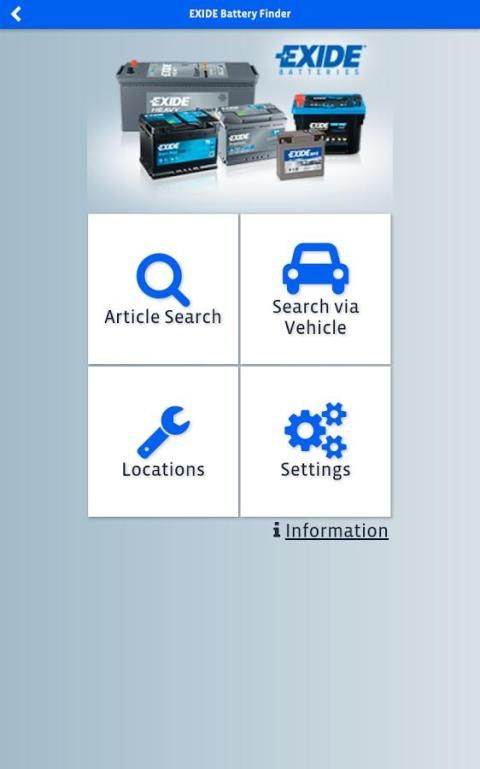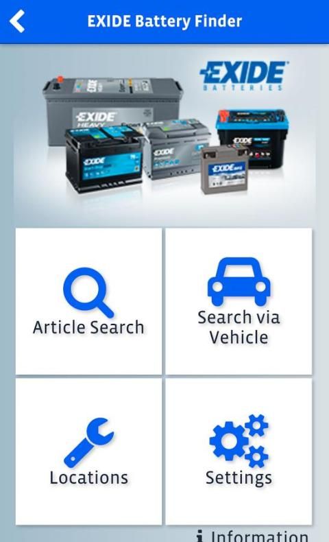 Berkat berbagai fitur pencarian, baterai seleksi dibuat mudah hanya dengan memasukkan salah satu informasi kendaraan berikut: Plat nomor / pendaftaran, kendaraan membuat dan model atau nomor bagian baterai asli. Ini termasuk bagian nomor Exide dan beberapa merek baterai terkenal lainnya.