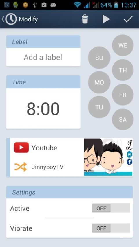 - Membuat atau memodifikasi alarm langsung dari aplikasi Youtube resmi dengan menggunakan tombol share, atau gunakan alarm Mudah built-in video yang picker