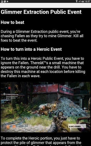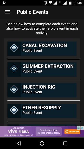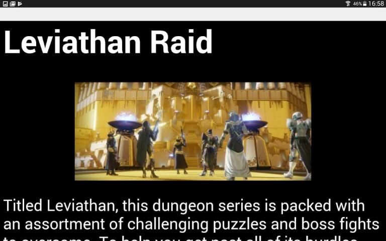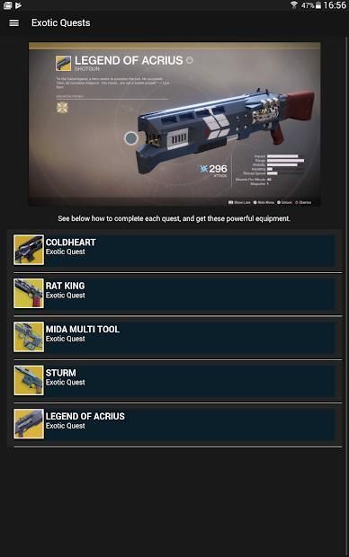 Aplikasi ini menyatukan kiat dan tutorial yang ditemukan di internet tentang cara menyelesaikan aktivitas game Destiny2.