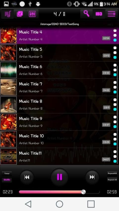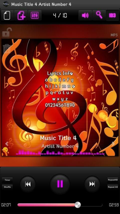 (Folder, album, penyanyi bermain, visualizer, Equalizer, Reverb, LRC lirik, ID3 tag mengedit, beberapa tema, pengaturan visual pengguna, dan AB ulangi, putar acak, daftar pengguna, mengedit, menyimpan, menghapus, multi-fungsi musik pemain)