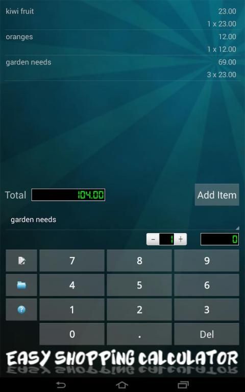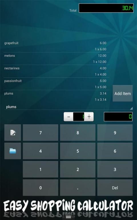 Dengan Mudah Belanja Calculator, Anda dapat membuat daftar seluruh item yang Anda butuhkan ketika Anda mendapatkan ke toko. Sementara belanja, jumlah input dan harga, dan Anda akan memiliki total berjalan seperti yang Anda terus belanja. Item belum terdaftar di app? Hanya menambahkan ke daftar item. Jika ada dan jumlah luas item yang tidak tercantum dalam aplikasi, Anda dapat membuat daftar pada PC Anda dan mentransfernya ke aplikasi melalui USB.