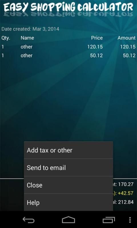 Jika Anda memiliki sebuah bisnis, Anda dapat menggunakan Easy Shopping Kalkulator untuk biaya keluar pekerjaan Anda. Mudah dan nyaman untuk ketika Anda keluar di lapangan jauh dari komputer Anda. Bahkan mengirim tagihan dan faktur melalui e-mail