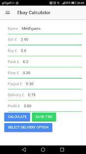 kalkulator sederhana dari keuntungan yang diperoleh dengan menjual barang di eBay memperhitungkan biaya perolehan, pengiriman, kemasan, Paypal dan eBay biaya.
