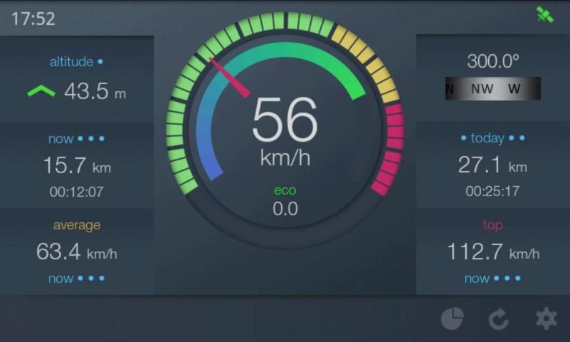 ● Semua indikator berguna adalah pada layar utama, sehingga memungkinkan Anda untuk mengontrol berlalu jarak, waktu, percepatan, tinggi, maksimum dan kecepatan rata-rata. Anda dapat beralih di antara indikator kecepatan maksimum dan rata-rata, jarak dan waktu berbagai periode dengan satu sentuhan.
