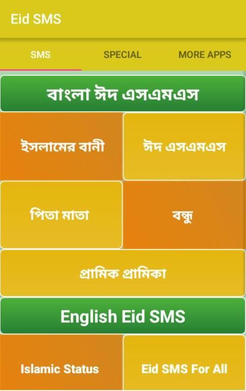 Dalam bagian ini kita menambahkan beberapa khusus SMS fitur eid, status Islam, orang tua eid SMS, teman eid SMS, pecinta eid SMS.