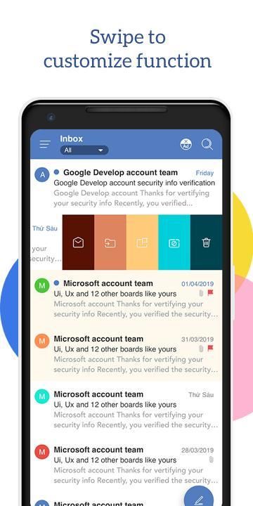 - Swipe to customize function such as a move to trash, forward email, mark unread and so on.