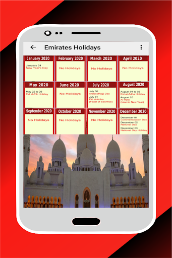 Download the application, Emirates Calendar Holidays, only available for Android devices.