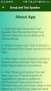 Emoji and Text Speaker App will Speak your Text in English(U.K) and It will also Speak Emoji Meaning which you type in EditText.