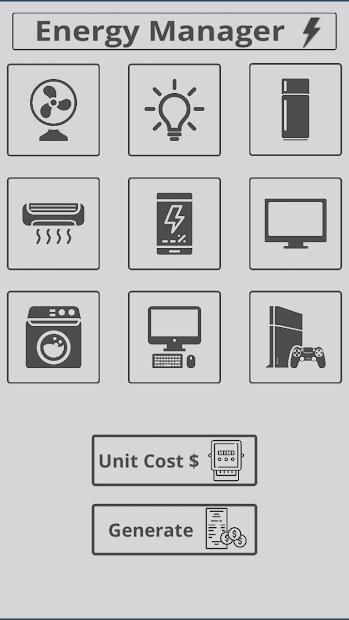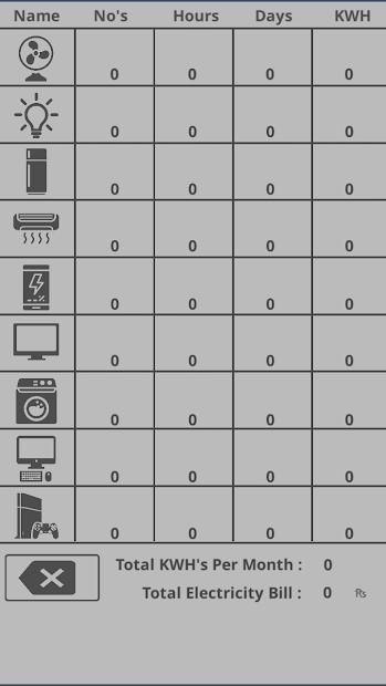 Aplikasi ini dapat memberi tahu Anda bahwa yang mana salah satu barang rumah tangga Anda menghabiskan lebih banyak uang. Kami telah menambahkan sembilan barang listrik yang paling umum digunakan di rumah-rumah. Pengguna dapat dengan mudah memasukkan jumlah item dan "Watts" mengkonsumsi per perangkat dan juga harus memasukkan "Biaya per unit" tanpa itu lembaran tagihan akhir tidak akan ditampilkan.