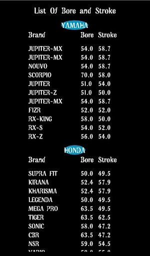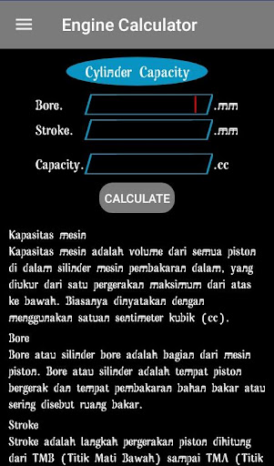 Engine Calculator dapat membantu menghitung kapasitas cilinder dan RPM. aplikasi ini juga dilengkapi daftar bore dan stroke dari motor standar dari berbagai merek