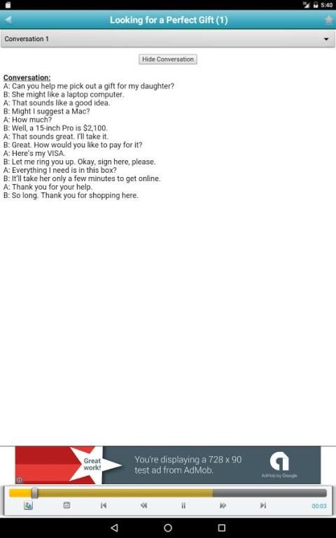Percakapan Bahasa Inggris adalah alat utama untuk pelajaran belajar bahasa Inggris Anda, dan sekarang Anda dapat melakukan semua itu pada kecepatan Anda sendiri. Download aplikasi hari ini, dan mulai belajar percakapan bahasa Inggris untuk mengembangkan mendengarkan bahasa Inggris dan kemampuan berbicara.