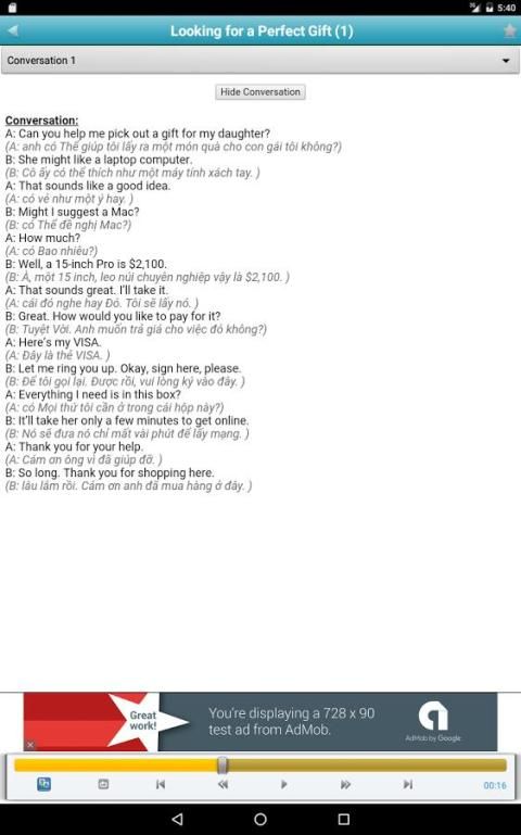 Aplikasi ini juga dilengkapi dengan alat menerjemahkan, membuat proses belajar Anda jauh lebih mudah. Semua percakapan dapat diakses setiap saat, memberikan Anda kemampuan untuk belajar percakapan bahasa Inggris pada kecepatan Anda sendiri. Praktek sepanjang track audio, dan Anda akan dapat meningkatkan pembelajaran bahasa Inggris dan keterampilan berbicara dalam waktu singkat.