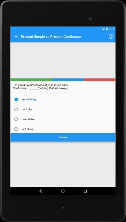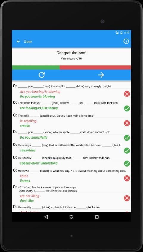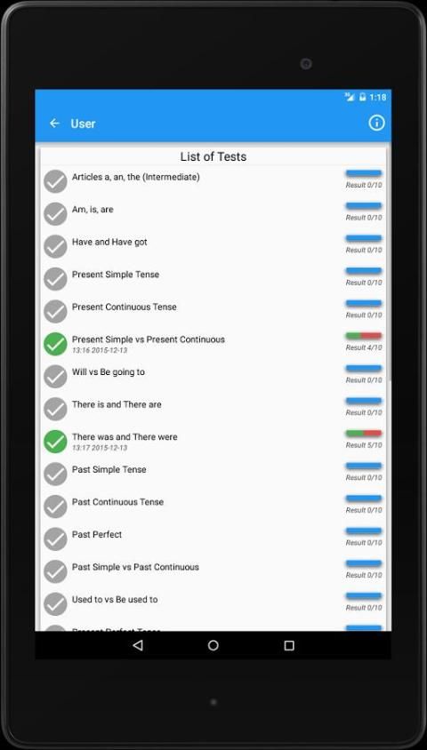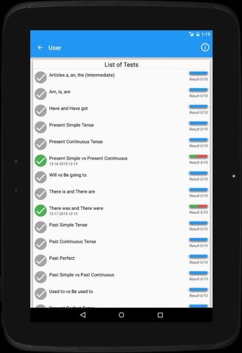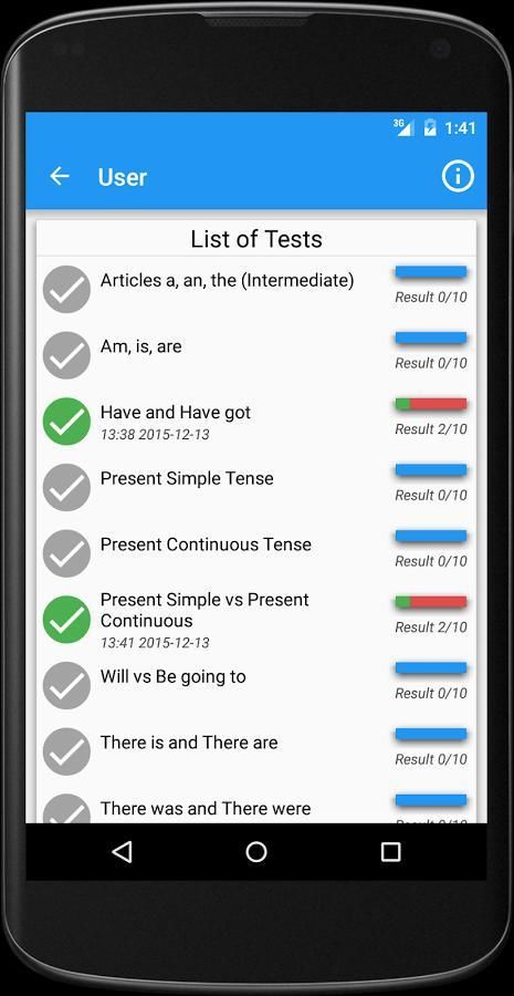 Aplikasi ini menawarkan 30 tes pada topik tata bahasa yang berbeda masing-masing memiliki 10 pertanyaan. Setelah setiap pertanyaan Anda akan melihat penjelasan tata bahasa dengan pilihan yang tepat. Fitur ini membantu untuk memeriksa pengetahuan Anda dan belajar atau menyegarkan aturan-aturan tertentu. Pada akhir tes Anda akan melihat daftar lengkap dari semua jawaban yang benar dan yang salah.