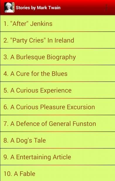 Mark Twain adalah seorang penulis terkenal dengan banyak cerita yang bagus. Menginstal aplikasi ini dan menikmati cerita setiap kali Anda memiliki waktu luang. Anda dapat menemukan cerita yang terkenal berikut: