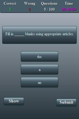 This application has been developed for testing your English grammar skills. It has 1,00,000 multiple choice questions and answers. This English test has been designed in the best possible manner so that the user can constantly improve his/her English reading, writing and speaking skills. This English language testing application suits for all lower, intermediate and higher levels as this application carries a combination of questions for testing the user from the basic level to the highest level. The test has been divided into ten different levels and the questions in each level will be displayed randomly.
