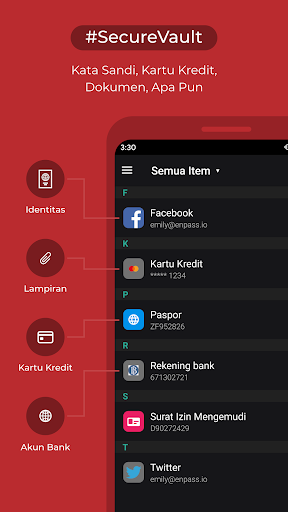 * Menyimpan Segalanya- Brankas aman untuk info masuk Anda, kartu kredit, rekening bank, lisensi, lampiran, atau jenis informasi lainnya.
