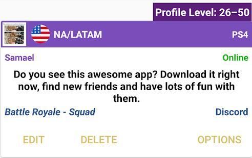 Dengan aplikasi ini Anda akan dapat menemukan pemain Fortnite dan menghabiskan saat-saat epik saat Anda bermain Fortnite. Anda juga dapat chatting dengan mereka secara real time.