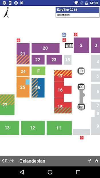 Zur besseren Orientierung können Pläne eingenordet angezeigt werden. Optimal als Wegweiser auf dem Messegelände. Vom Geländeplan kann in die Hallen geklickt werden.