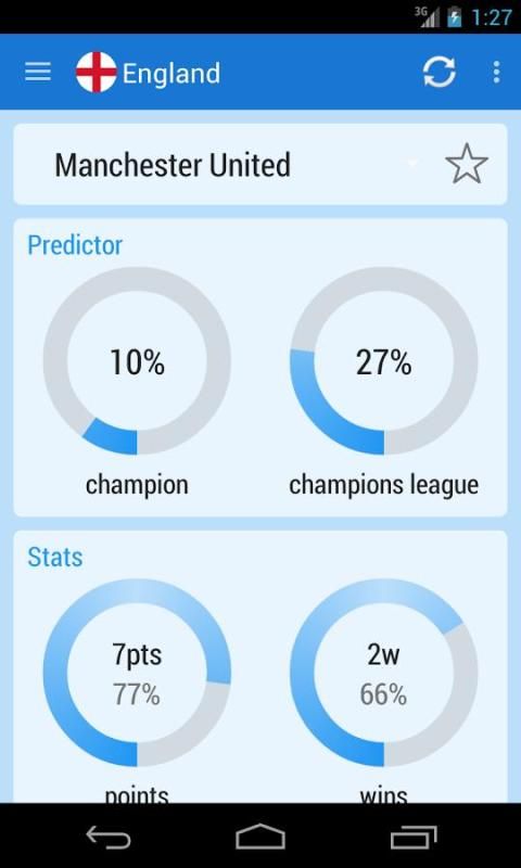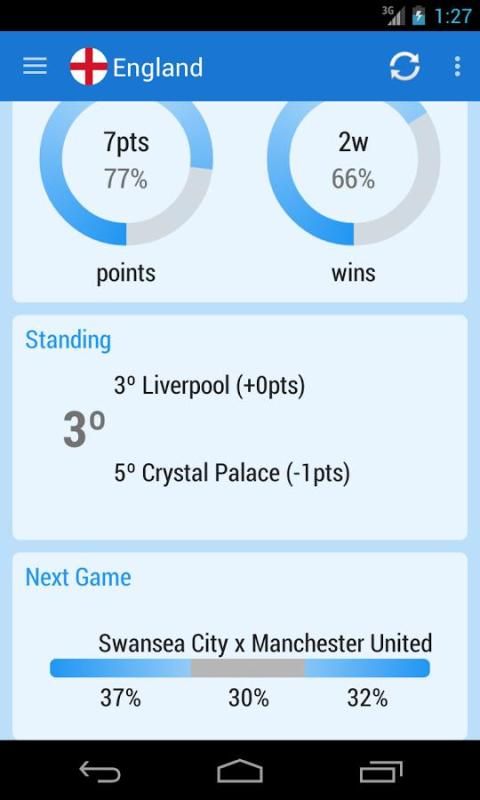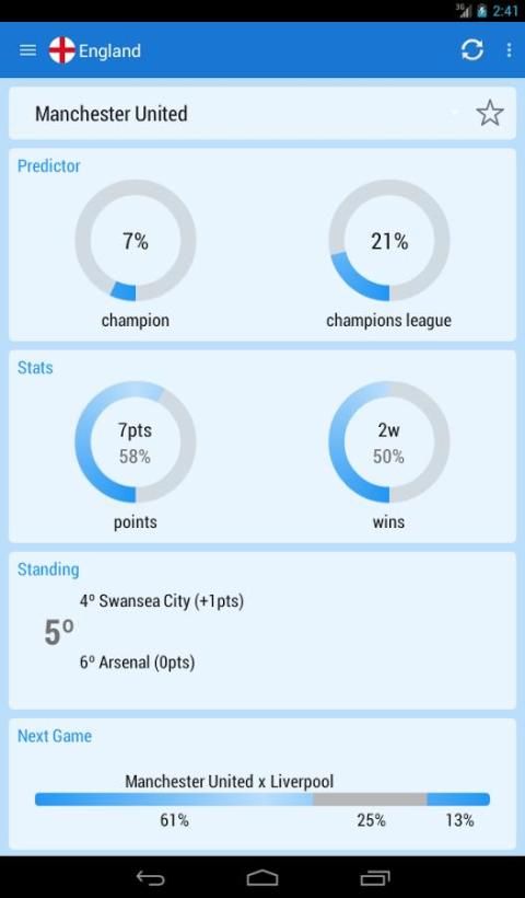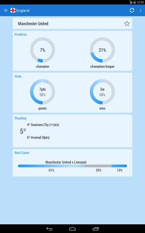 A exclusive Dashboard screen brings to you all the key information from each team, as the probability of being champion, qualifying for the champions league, % of points and victories, the Predictor for the next game, and standing position.