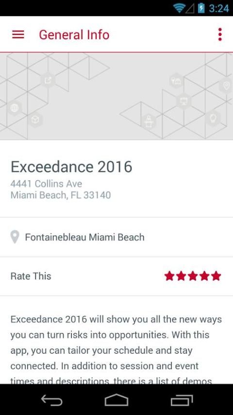 Terlampaui 2016 akan menampilkan semua cara-cara baru Anda dapat mengubah risiko menjadi peluang. Dengan aplikasi ini, Anda dapat menyesuaikan jadwal Anda dan tetap terhubung. Selain sesi dan acara kali dan deskripsi, ada daftar dari demo yang akan di The Lab dan peta untuk mendapatkan Anda di sekitar. Ada berbagai cara untuk mencari agenda menggunakan kata-kata kunci, menilai sesi, dan terhubung dengan peserta lain. Plus, Anda akan mendapatkan update konferensi real-time dan pengingat.