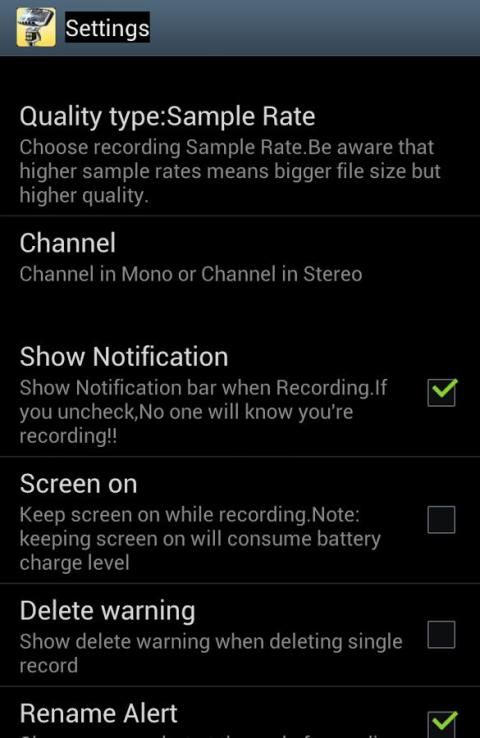 Ahli Voice Recorder mencatat kualitas tinggi (.wav) suara, dan memberikan pilihan dari tingkat sampel untuk mengontrol kualitas dan ukuran file rekaman Anda.