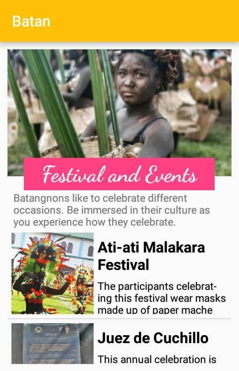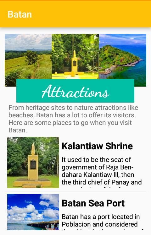 Sebuah aplikasi Android informatif yang menampilkan tujuan wisata, keahlian memasak, dan budaya kotamadya Batan, Aklan. Cari tahu apa yang Anda belum dieksplorasi, dan menemukan Batan!