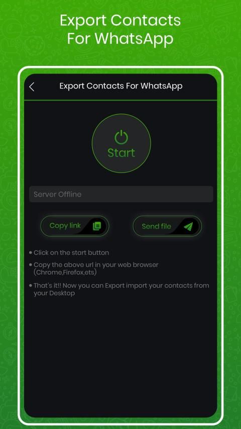 app also provide an option to export contacts into another device, Just with a simple process like click on the start button, Copy your URL in your web browser and easily export/import your contacts from your desktop,