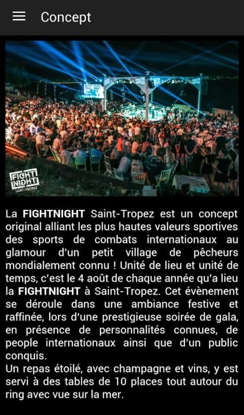 The fightnight Saint-Tropez merupakan konsep asli menggabungkan nilai-nilai olahraga tertinggi internasional glamor olahraga tempur dari desa kecil yang dikenal orang-orang berdosa di seluruh dunia! Kesatuan tempat dan satuan waktu, yaitu pada tanggal 4 Agustus setiap tahun yang mengambil menempatkan fightnight di Saint-Tropez. Acara ini berlangsung dalam suasana yang meriah dan nyaman pada gala malam bergengsi di hadapan kepribadian dikenal, selebriti internasional dan penonton terpesona.