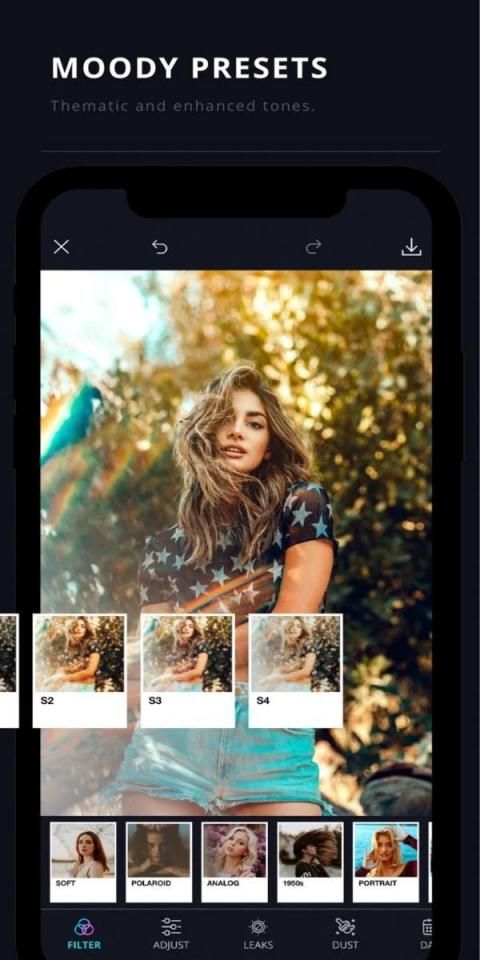 - Thematic and enhanced tones for your photos: Soft / Polaroid / Analog / 1950s / Portrait / Epic Film / Warm & Cozy / Rainbow / Unicorn.