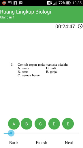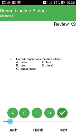 Aplikasi ini menampilkan berbagai tipe soal pada tiap bab nya, disertai dengan kunci jawaban dan nilai sebagai evaluasi atas latihan yang dikerjakan, sehingga akan sangat membantu menguasai materi BIOLOGI. Selain Evaluasi per BAB Aplikasi ini juga dilengkapi dengan latihan soal Ujian MID semester, Ujian Semester, UN, dan SBMPTN