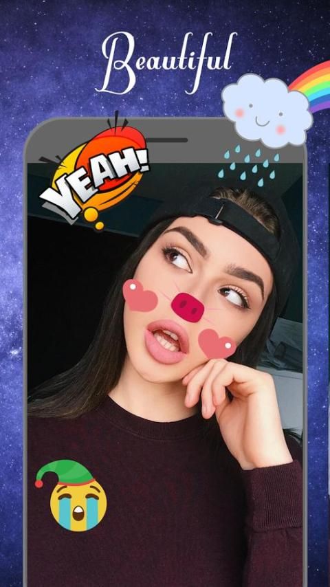 Banyak set akan memberikan Anda kesempatan untuk memilih dari seperti Hewan Peliharaan stiker, Kartun, Cinema. Menambahkan smiley Doggy Wajah, pelangi filter, Kelinci Wajah, mata anime, air mata hanya dalam beberapa detik.