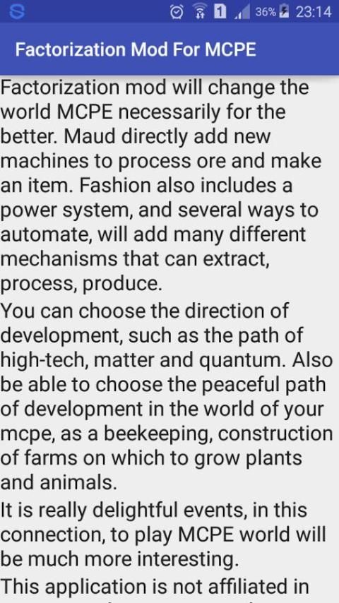 Faktorisasi mod akan mengubah dunia MCPE tentu menjadi lebih baik. Maud langsung menambahkan mesin-mesin baru untuk mengolah bijih dan membuat item. Mode juga mencakup sistem listrik, dan beberapa cara untuk mengotomatisasi, akan menambah banyak mekanisme yang berbeda yang dapat mengekstrak, proses, menghasilkan.