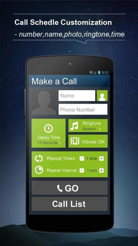 ★ Sesuaikan jumlah palsu id pemanggil, nama penelepon, gambar kontak, nada dering dan waktu yang dijadwalkan memanggil.