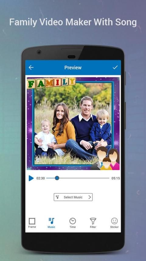 Keluarga Maker Video Dengan aplikasi Music membantu Anda untuk membuat cepat dan mengagumkan slideshow dengan foto dan musik yang dipilih. Untuk membuat video atau slideshow dari aplikasi ini Anda hanya dapat memilih foto membentuk gallery atau foto yang diambil dari kamera, menambahkan trek musik dan pilih animasi yang menakjubkan.