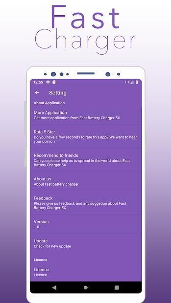 Fast Charger Turbo X5 adalah aplikasi utama, yang dapat meningkatkan baterai Anda hingga 30-40%. APP secara otomatis aktif ketika Anda menghubungkan pengisi daya Anda dan itu akan meningkatkan kecepatan pengisian daya Anda.