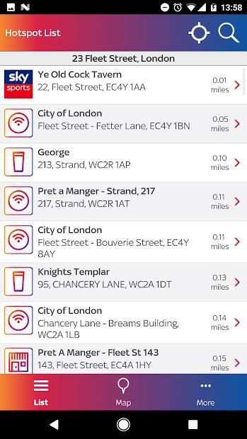 Dengan aplikasi Sky WiFi Finder, Anda dapat menelusuri hotspot Wi-Fi lokal, dan bahkan melihat mana tempat hotspot memiliki Sky Sports serta Wi-Fi yang besar.