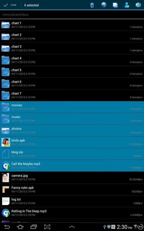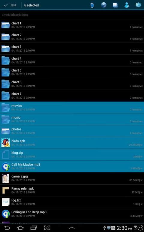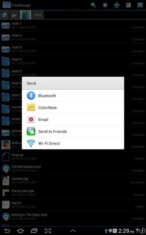 * If your phone installed wechat, facebook, twitter, line, gmail directly through the file manager to call these programs to share your files to your friends. While the file manager supports Bluetooth sharing and LAN share.