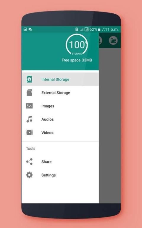 Lihat Rincian Gambar, Video, Musik, Apps, Dok & PDF, Compress File, Downloads, Internal & External Storage rincian di layar.