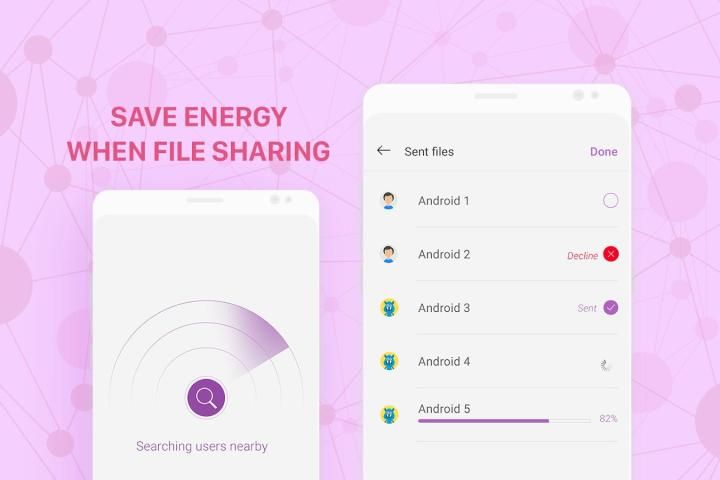 Karena file sharing super cepat, sehingga Kirim file-file besar - berbagi video aplikasi tidak memerlukan biaya banyak baterai. Anda dapat dengan nyaman mengirim file tanpa khawatir bahwa ponsel akan kehabisan baterai.