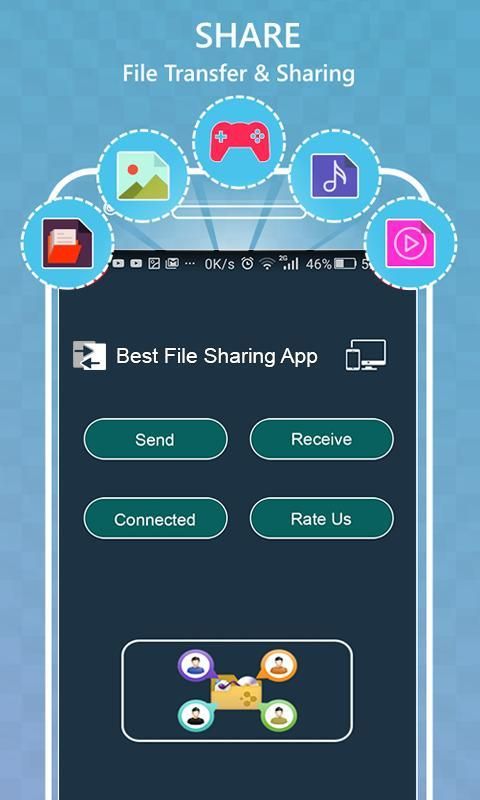 Aplikasi ini memungkinkan pengguna untuk berbagi file termasuk file Teks, PDF, Excel, dll. Pengguna dapat berbagi video, audio, dan aplikasi dengan kecepatan transfer tinggi.