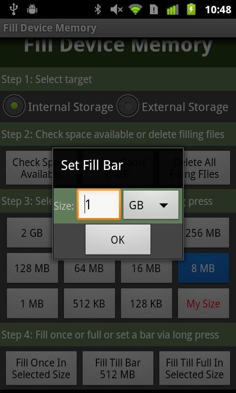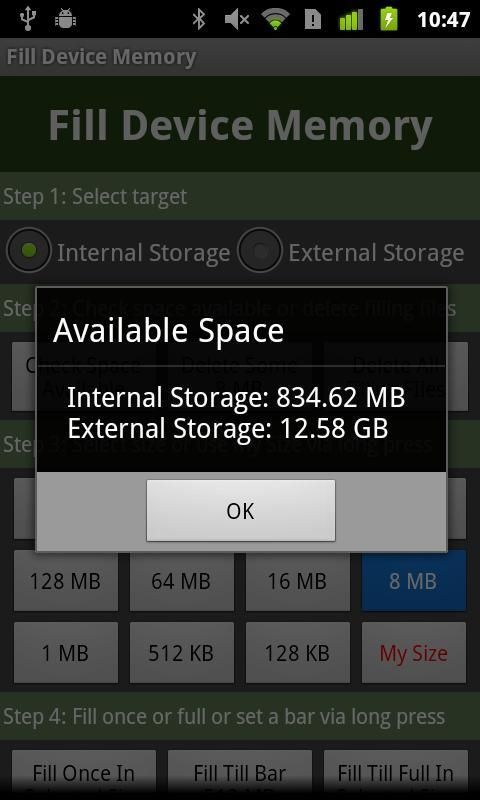Jika Anda ingin memeriksa apakah itu benar-benar bekerja, pergi ke Settings-> Storage dan memeriksa apa yang terjadi dengan ukuran penyimpanan Anda. Dan memeriksa file yang dibuat dilabel timestamp melalui setiap File Explorer di bawah "Fill_Device_Memory" folder.