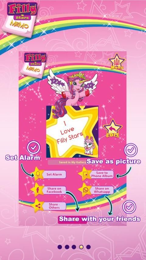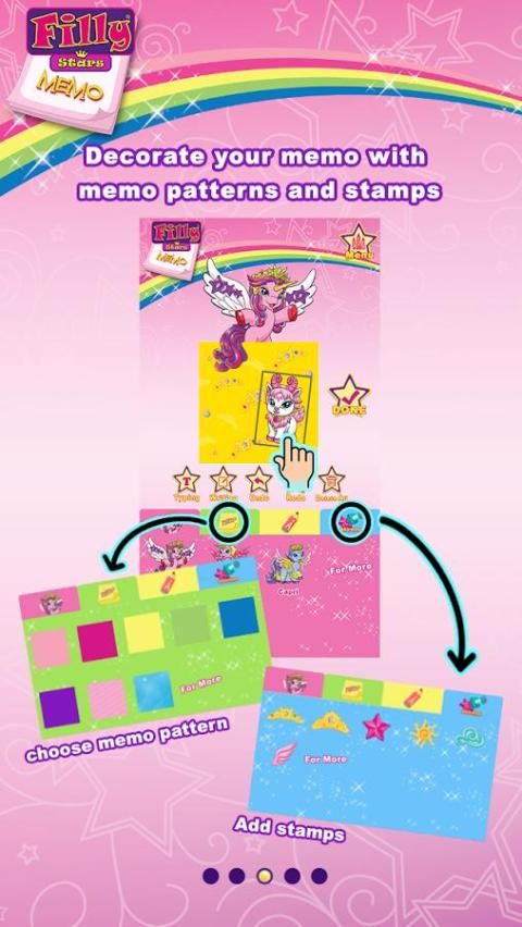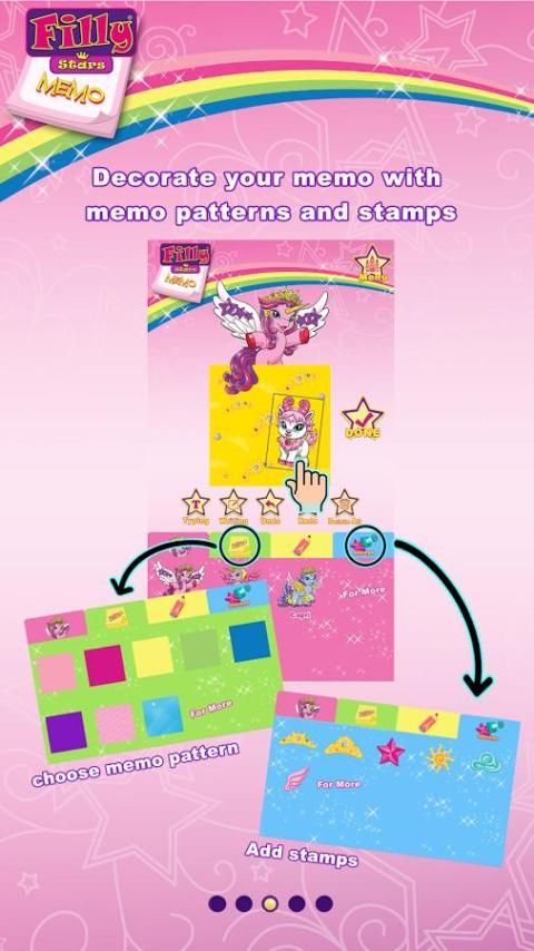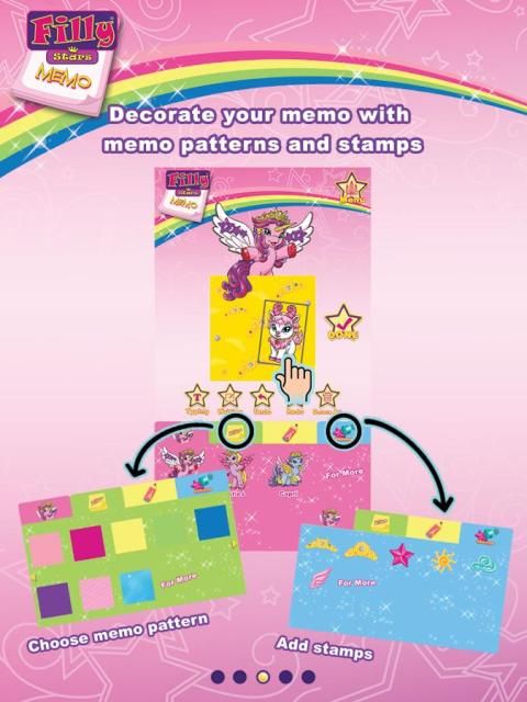 Filly bintang Memo tidak HANYA aplikasi memo tradisional. Ini menyediakan berbagai pilihan Filly Bintang Karakter, pola, perangko warna-warni dan Filly Hewan bagi Anda untuk menghias pengingat pribadi dan kartu pesan Anda sendiri. personalisasi Filly Bintang kartu pesan Memo untuk teman dan keluarga.