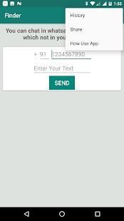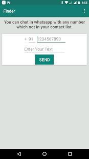aplikasi Finder memungkinkan Anda untuk membuka obrolan dengan siapapun di Whatsapp tanpa menyimpan / nya nomor teleponnya di ponsel, seperti yang kita semua tahu bahwa kita tidak dapat membuka obrolan dengan seseorang tanpa menyimpan nomor pada kontak Anda, tetapi dengan Finder Anda dapat melakukannya dengan mudah cara hanya dengan menulis jumlah teman Anda atau siapa pun yang Anda inginkan dan menulis pesan dan klik mengirim dan percakapan dengan jumlah yang Anda tulis akan muncul dan Anda dapat mengirimkan pesan.