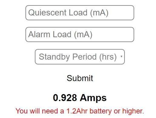 Cukup mengisi beban Anda diam (beban standby) dan beban alarm (baik dalam milliamps) dan kemudian periode standby Anda di jam secara akurat menghitung ukuran baterai minimum yang diperlukan untuk panel.
