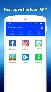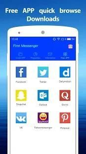 Messenger pertama adalah alat chatting yang membantu Anda untuk mengetahui semua alat ngobrol di telepon Anda dan menghemat waktu dan energi dengan menghilangkan kebutuhan untuk menghabiskan banyak waktu mencari software untuk menemukan alat mengobrol lebih cepat. Hal ini juga membantu Anda menghitung berapa kali setiap aplikasi yang digunakan, yang chatting alat yang digunakan kurang, dan lebih mudah dan lebih nyaman.