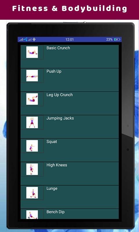 Dalam aplikasi ini, Anda mendapatkan latihan khusus dan berbeda untuk setiap otot dan diilustrasikan dengan karakter animasi. Ini termasuk latihan untuk Abs, Dada, Leher, Kembali, Bahu, Biceps, Triceps, lengan, glutes, paha belakang, Paha dan otot Betis. Ini termasuk jongkok, duduk, mendorong, menarik, dagu, peregangan, ayunan, crunch, tekan dan latihan lainnya. Aplikasi ini adalah panduan latihan penting untuk dilatih diri binaragawan dan dengan demikian bertindak sebagai pelatih pribadi untuk masing-masing dari Anda.
