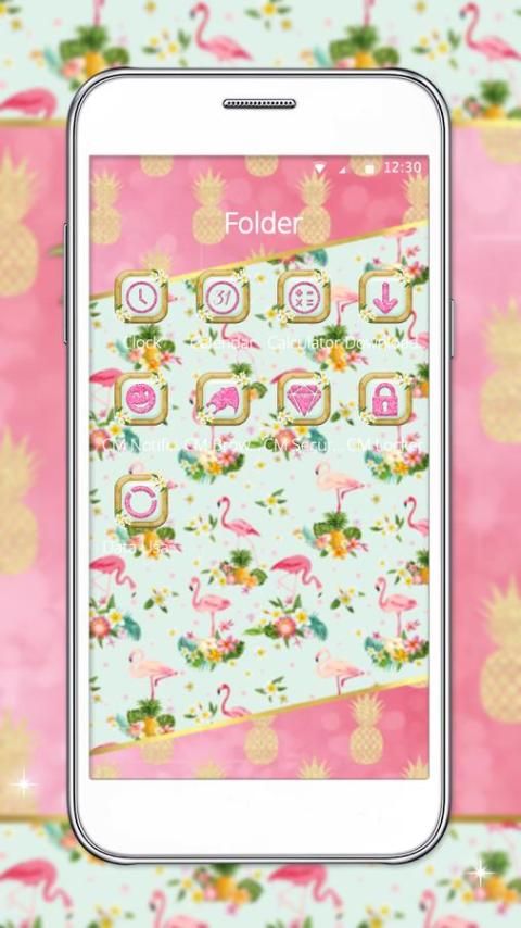 tema tropis ini diisi dengan flamingo pink, putih, merah muda, dan bunga-bunga tropis oranye, nanas dan kelucuan. Memperhatikan ke layar folder kustom dengan tema terbalik untuk menunjukkan lebih banyak flamingo dan hanya menyoroti nanas gemerlapnya emas. Setiap ikon hati-hati dipilih untuk mencocokkan tema nanas untuk menciptakan tampilan tropis sementara masih mudah digunakan.