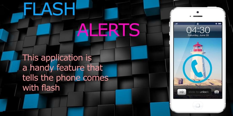 Flash alert aplikasi memberitahukan dengan berkedip lampu kamera ketika Anda memiliki panggilan masuk atau sms masuk. aplikasi ini digunakan ketika Anda tidak mendengar nada dering atau sel Anda dalam modus senyap. Anda dapat dengan mudah menemukan telepon Anda jika Anda menempatkan di salah menaruhkan menggunakan aplikasi ini.
