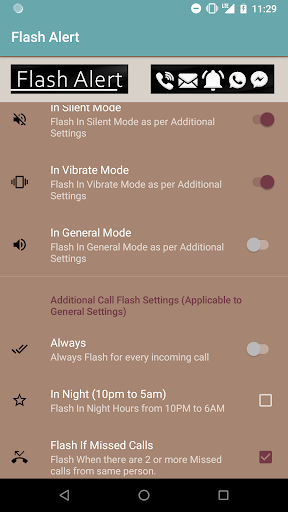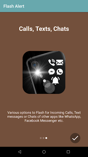 Flash Alert adalah aplikasi yang cerdas dan sangat berguna yang sepenuhnya gratis. Aplikasi akan berkedip flash kamera telepon setiap kali ada panggilan masuk yang penting atau pesan teks. Anda juga dapat mengatur aplikasi untuk mengedipkan flash kamera untuk pesan obrolan yang masuk dari berbagai aplikasi messenger seperti WhatsApp atau Facebook. Flash Alert kompatibel dengan sebagian besar perangkat Android yang menjalankan OS 4.4 dan di atas terlepas Tidak ketika ada panggilan penting yang datang. Menggunakan aplikasi Anda dapat mengatur berbagai pengaturan konfigurasi untuk flash seperti hanya flash saat ponsel dalam mode diam atau getaran.