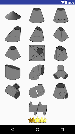 Kalkulator akan menghitung dimensi yang diperlukan untuk konstruksi segmen pola datar lobsterback tikungan, siku, kerucut dan terpotong pipa, kerucut terpotong dengan metode simpul dan triangulasi yang dapat diakses, tata letak pipa terpotong atau potongan pipa pada pola sudut datar, pipa ke persimpangan kerucut pada pola datar sumbu, pipa terpotong oleh pola datar radius, pola datar tata letak kerucut penuh, persegi panjang Putaran atau persegi ke putaran pola tata letak transisi, bulat ke persegi panjang atau bulat ke tata letak tata letak transisi persegi.